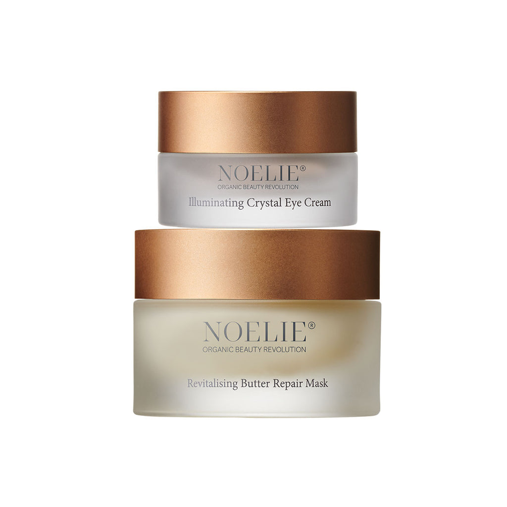 REVITALIZING BUTTER REPAIR MASK: Prunus Amygdalus Dulcis (Sweet Almond) Oil *, Simmondsia Chinensis (Jojoba) Seed Oil *, Borago Officinalis Seed Oil *, Hydrogenated Vegetable Oil **, Butyrospermum Parkii (Shea) Butter *, Glyceryl Dibehenate, Rosa Canina Seed Extract *, Tribehenin, Oenothera Biennis (Evening Primrose) Oil *, Glyceryl Behenate, Camellia Oleifera Seed Oil *, Olea Europaea (Olive) Fruit Oil *, Papaver Somniferum Seed Oil *, Schisandra Sphenanthera Fruit Extract, Ribes Nigrum Seed Oil, Cardiospermum Halicacabum Flower/Leaf/Vine Extract, Persea Gratissima (Avocado) Oil, Chamomilla Recutita (Matricaria) Flower Extract *, Echinacea Purpurea Root Extract *, Lecithin, Magnolia Officinalis Bark Extract, Lavandula Angustifolia Oil, Rosmarinus Officinalis (Rosemary) Leaf Extract *, Helianthus Annuus (Sunflower) Seed Oil *, Rosmarinus Officinalis (Rosemary) Leaf Oil *, Helianthus Annuus (Sunflower) Hybrid Oil *, Helianthus Annuus Seed Oil Unsaponifiables, Glyceryl Caprylate **, Tocopherol, Limonene ***, Geraniol ***, Citronellol ***, Coumarin ***, Citral ***, Linalool ***, Octyldodecanol, Alcohol (Component of extracts) *, (*ingredients from certified organic agriculture, **source of palm oil RSPO certified, ***from natural essential oils). Not to be used for children under 3 years of age. ILLUMINATING CRYSTAL EYE CREAM: Rosa Damascena (Damask) Flower Water *, Lavandula Angustifolia Flower Water *, Pentylene Glycol, Glyceryl Stearate **, Glycerin (plant based - Component of extracts), Aqua (Component of extracts), Cetearyl Alcohol **, Dicaprylyl Ether **, Jojoba Esters, Caffeine, Galactoarabinan, Camellia Oleifera Seed Oil *, Palmitic Acid **, Stearic Acid **, Carthamus Tinctorius (Safflower) Oleosomes, Alcohol (Component of extracts), Papaver Somniferum Seed Oil *, Vitis Vinifera (Grape) Seed Oil, Cannabis Sativa (Hemp) Seed Oil *, Acmella Oleracea Extract, Albizia Julibrissin Bark Extract, Avena Strigosa Seed Extract, Aesculus Hippocastanum (Horse Chestnut) Seed Extract, Opuntia Ficus-Indica Seed Oil *, Sodium Hyaluronate, Centella Asiatica Extract, Fagus Sylvatica Bud Extract *, Kigelia Africana Fruit Extract, Punica Granatum Seed Extract *, Ruscus Aculeatus Root Extract, Hydrolyzed Gardenia Florida Extract, Rosa Canina Seed Extract *, Sodium PCA, Camellia Sinensis Leaf Extract, Lecithin, Mangifera Indica (Mango) Seed Butter, Rosmarinus Officinalis (Rosemary) Leaf Extract *, Magnolia Officinalis Bark Extract, Helianthus Annuus (Sunflower) Seed Oil ***, Pullulan, Silica, Tocopherol, Gluconolactone, Darutoside, Maltodextrin, Xanthan Gum, Benzyl Alcohol, Benzoic Acid, Benzyl Salicylate ***, Citric Acid, Sodium Benzoate, Potassium Sorbate, Limonene ***, Geraniol ***, Linalool ***, Citronellol ***, (*ingredients from certified organic agriculture, **source of palm oil RSPO certified, ***from natural essential oils). Not to be used for children under 3 years of age.